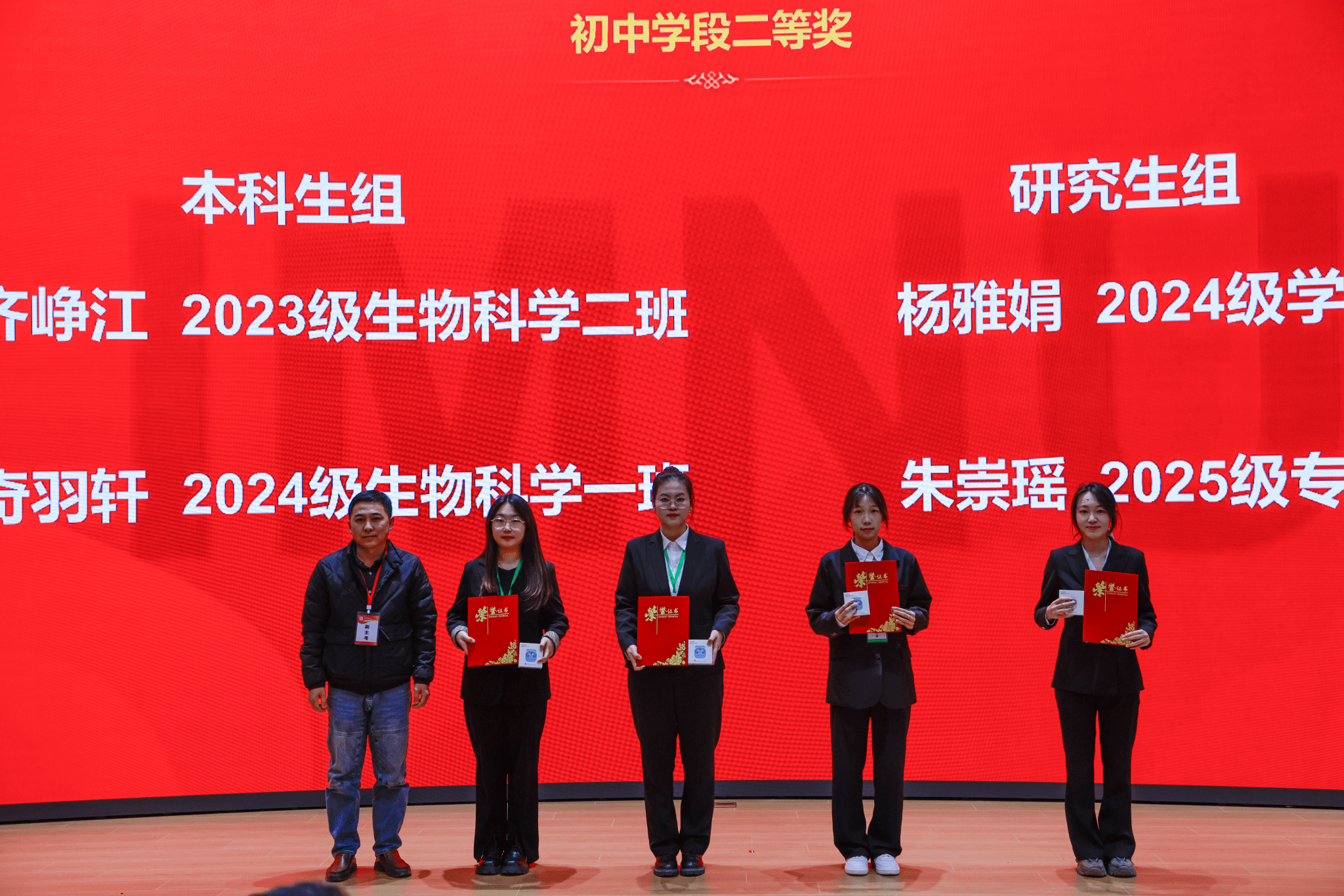 11月18日中午,大赛举行颁奖仪式。学院党委副书记、院长红雨老师在致辞中向获奖选手表示热烈祝贺,向辛勤付出的指导教师和组织团队致以诚挚感谢。她指出,本次大赛是学院教师教育工作的一次系统检验和集中展示,希望同学们以此为新的起点,进一步涵养教育情怀、打磨教学技能,在未来的教育岗位上成为点亮学生心灵的优秀教师;同时也希望广大教师继续发挥示范引领作用,共同推动我院师范类专业建设迈上新台阶。