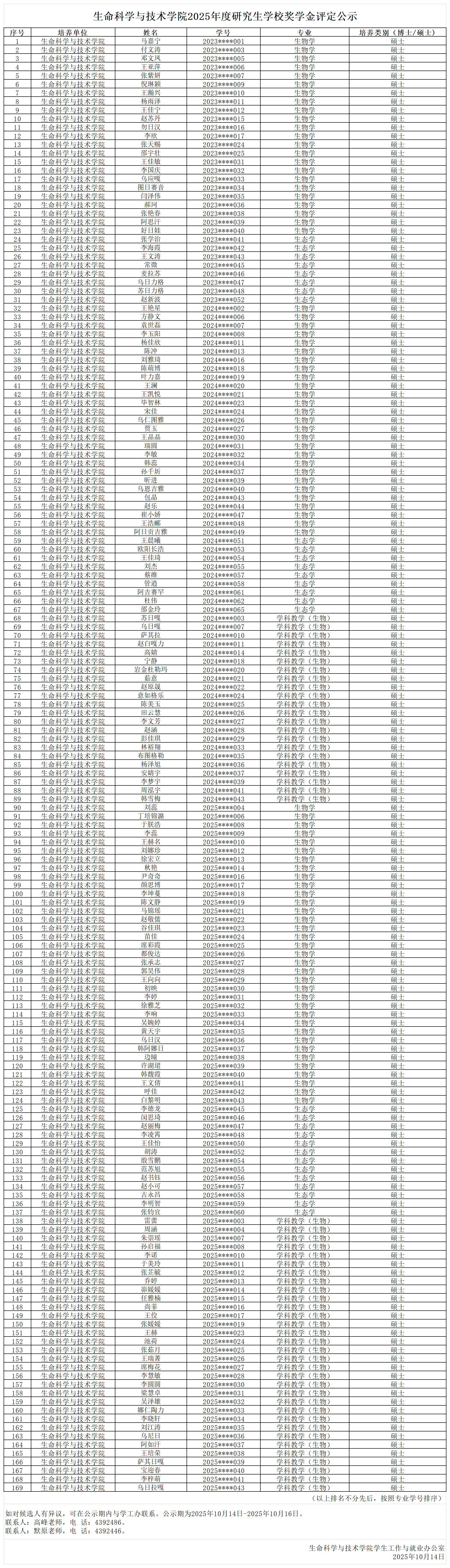 生命科学与技术学院2025年度研究生学校奖学金评定公示
