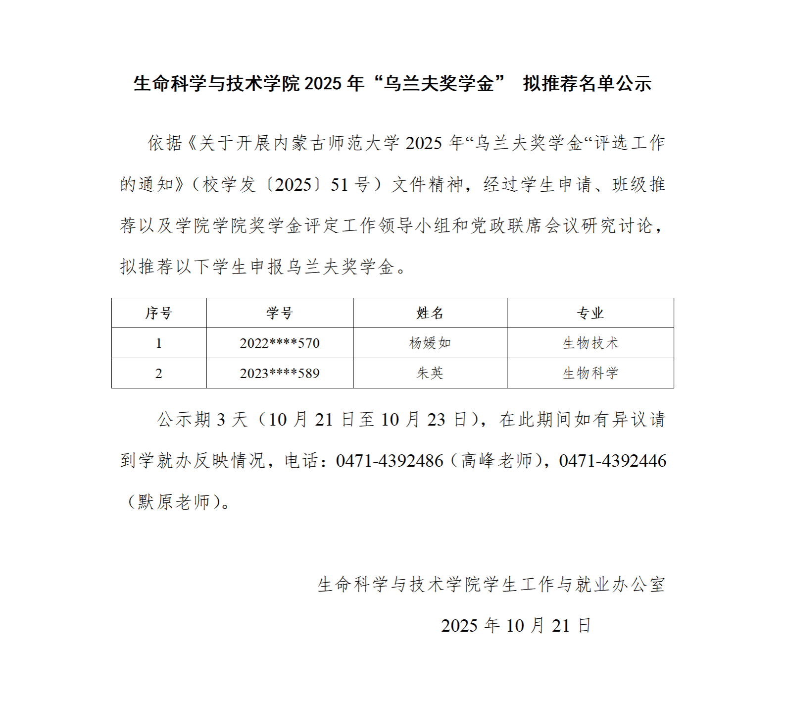 生命科学与技术学院2025年“乌兰夫奖学金”拟推荐名单公示