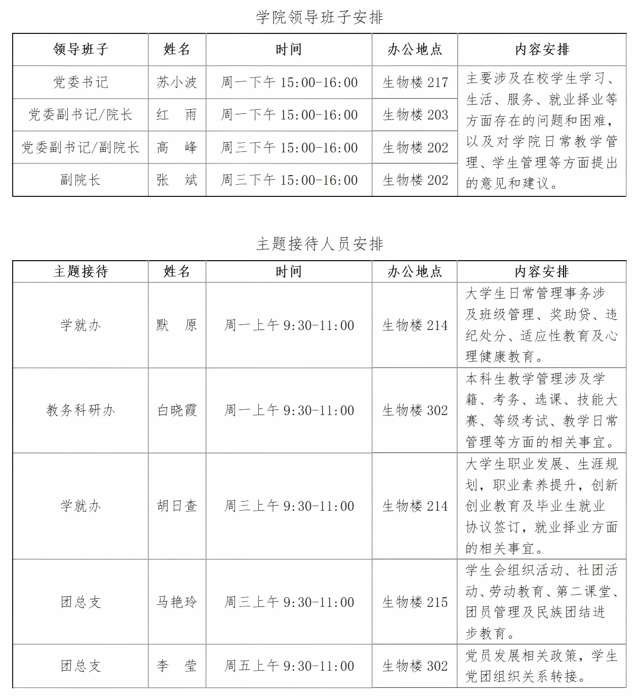 为认真贯彻落实立德树人根本任务,扎实推进“我为群众办实事”实践活动,广泛听取师生对学院各项工作的意见和建议,切实帮助师生解决急难愁盼问题,构建"诉求收集-问题研判-分类解决-反馈改进"的闭环管理模式。经学院党委研究决定,设立生命科学与技术学院开放接待日制度,具体安排如下: