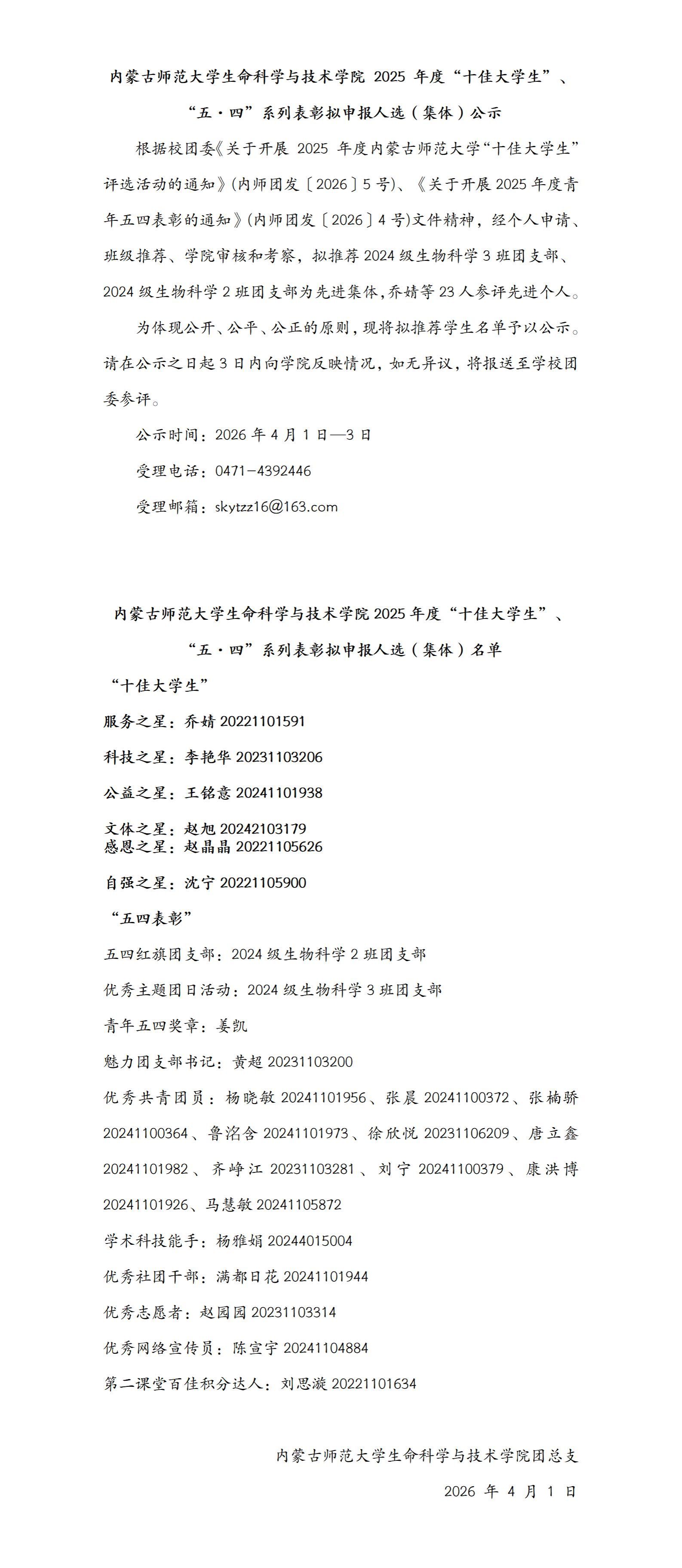 内蒙古师范大学生命科学与技术学院 2025 年度“十佳大学生”、“五·四”系列表彰拟申报人选(集体)公示